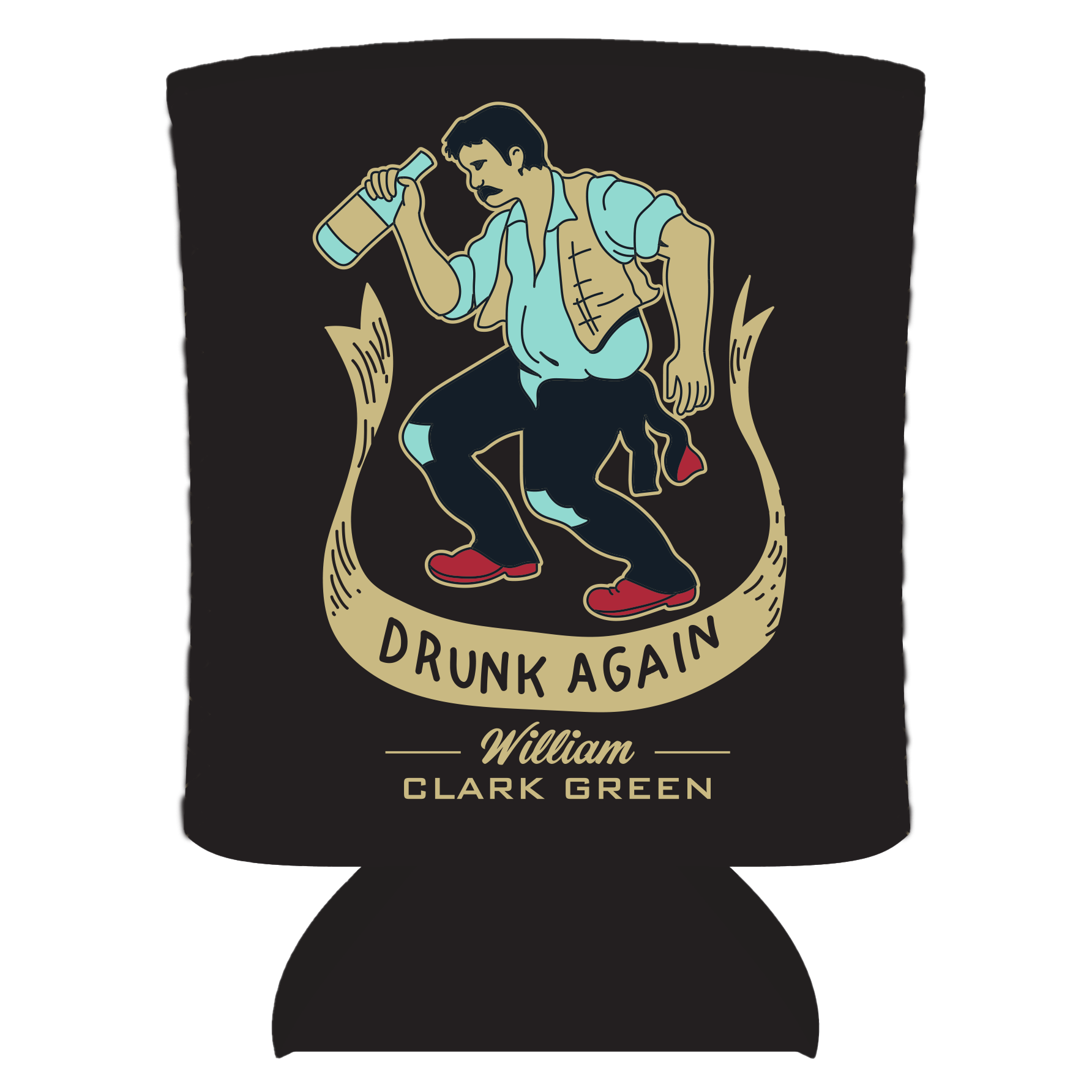 Black foam koozie featuring some cartoon artwork of a man holding a big bottle, and a ribbon surrounding him that reads, "Drunk Again".