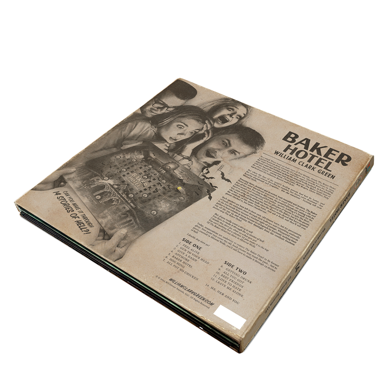 Take a trip through the Baker Hotel and play your way through the 14 stories of hell with the Vinyl pressing of William Clark Green's album "Baker Hotel" which includes a tri-fold hardcover, green vinyl pressing, and board game.