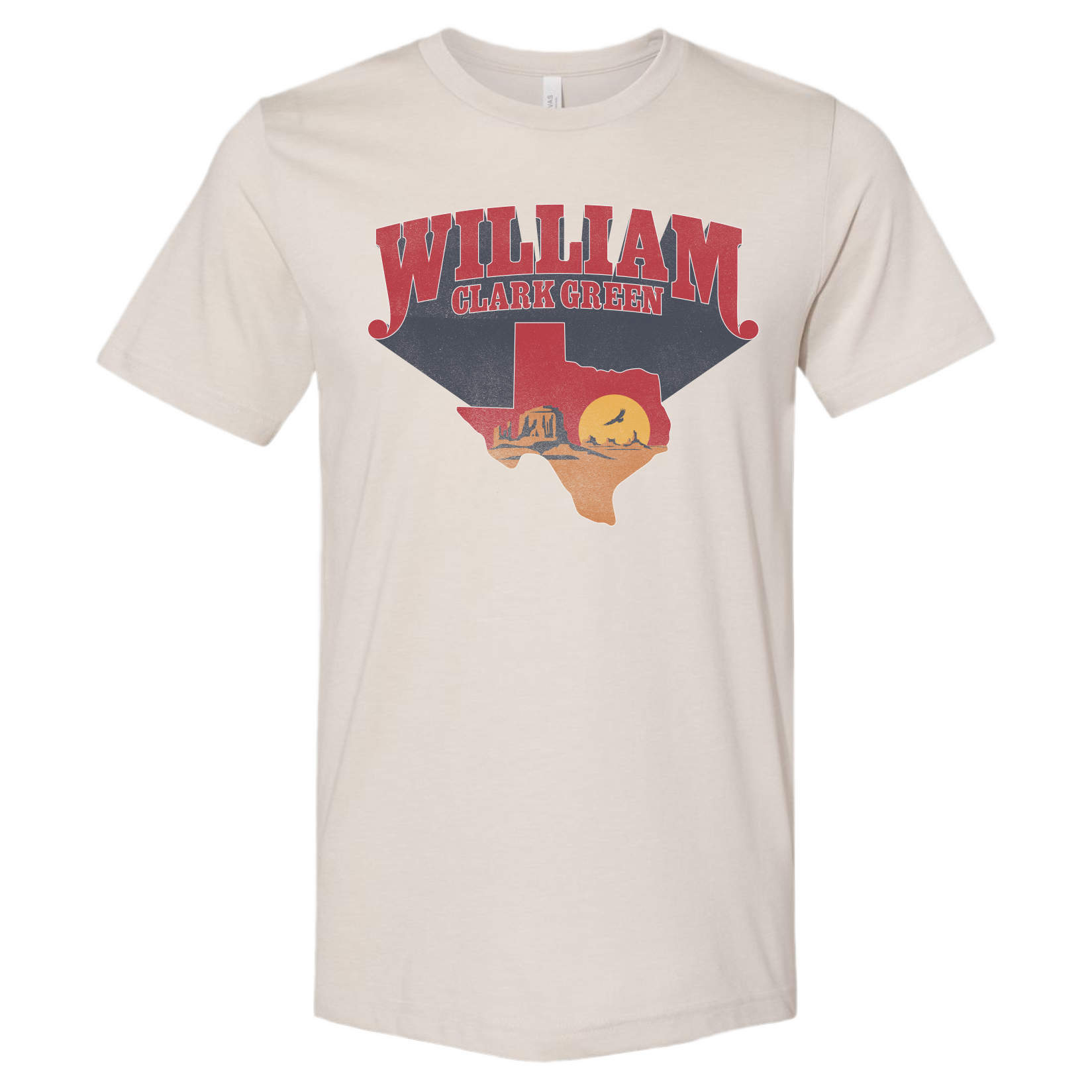 Heather dust tee featuring some screen printed desert sunset art in the shape of Texas on the front.
